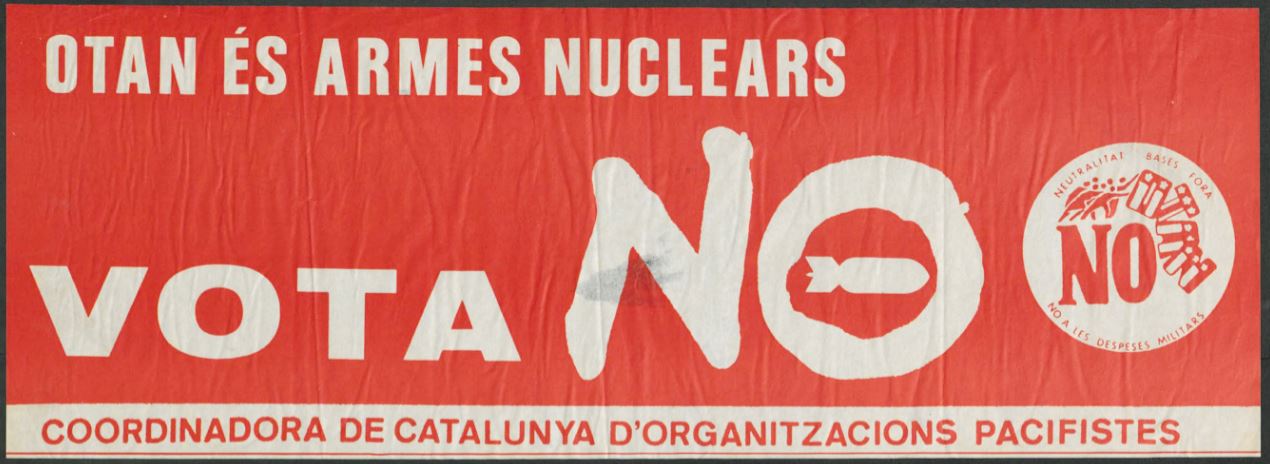 El 12 de març de 1986 es va celebrar un referèndum sobre la permanència o sortida de l’Estat espanyol a la OTAN, a la que s’havia entrat quatre anys abans en la darrera etapa del govern d’UCD. El referèndum va ser motiu d’una gran campanya de mobilització social per part dels partidaris de sortir-ne. La capacitat de mobilització d’aquest moviment pel No fou enorme, especialment a Catalunya, amb múltiples manifestacions, marxes sobre les bases militars o cadenes humanes. Tot i la resposta positiva al tractat atlantista de la resta de l’Estat que va suposar la permanència espanyola a la OTAN, a Catalunya el No va guanyar gràcies a la participació activa i engrescadora de tot un seguit de moviments socials antimilitaristes, de desobediència civil, de valors en pro de la no-violència i la cultura per la pau.
