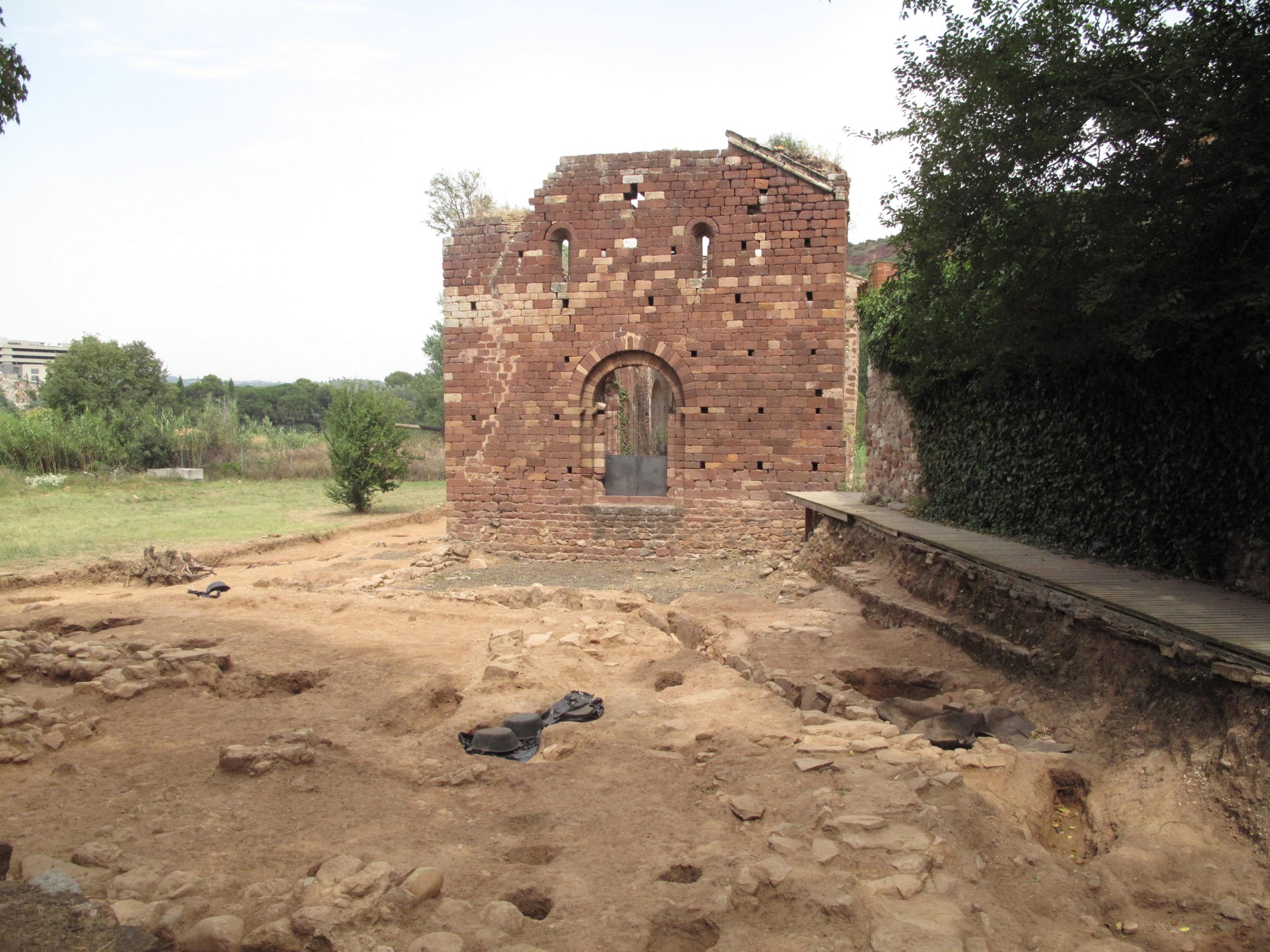 Fotografia de l’estat de l’excavació, adjacent a la masia on realitzavem l’entrevista a l’Alfred. Al centre, podem observar l’església romànica que dona el nom al jaciment. Font: Guillem Garcia Solé