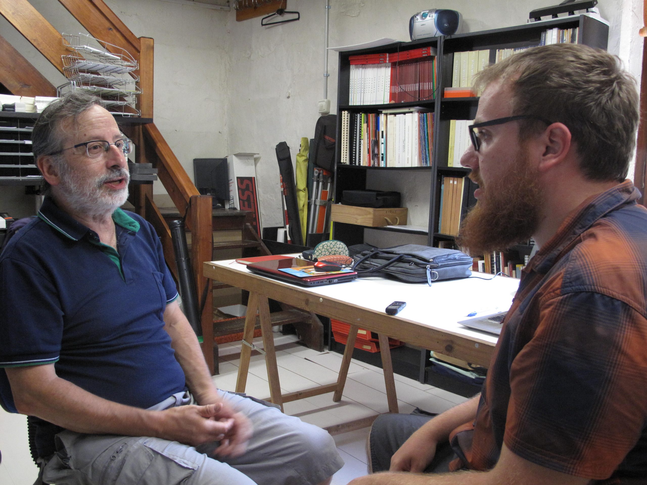 Fotografia de l'inici de l'entrevista, que ha transcorregut als despatxos on es gestiona la informació i material arqueològic. Font: Centre d'Estudis Martorellencs.